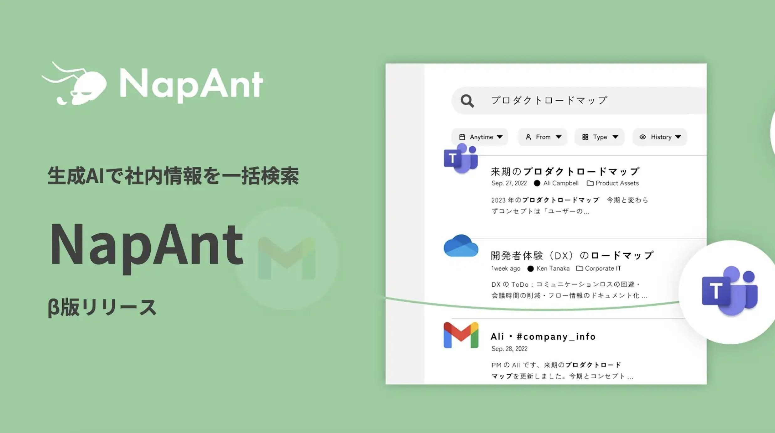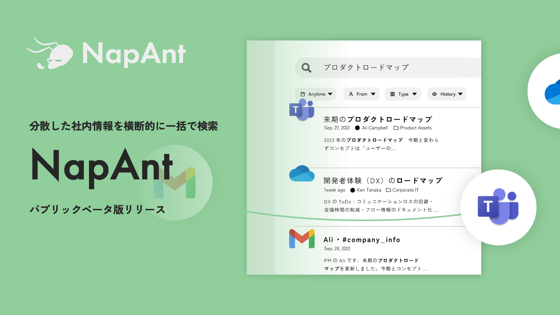 「NapAnt (ナップアント)パブリックベータ版」をリリースし、一般提供を開始したことをお知らせいたします。 「NapAnt」は、分散した社内情報を横断的に一括で検索することができるサーチエンジンです。多くのビジネスシーンで使われているTeamsやOutlookといったMicrosoftアプリとワンクリックで連携して検索できるサーチエンジンとしては、国内初であり唯一のシステムです。